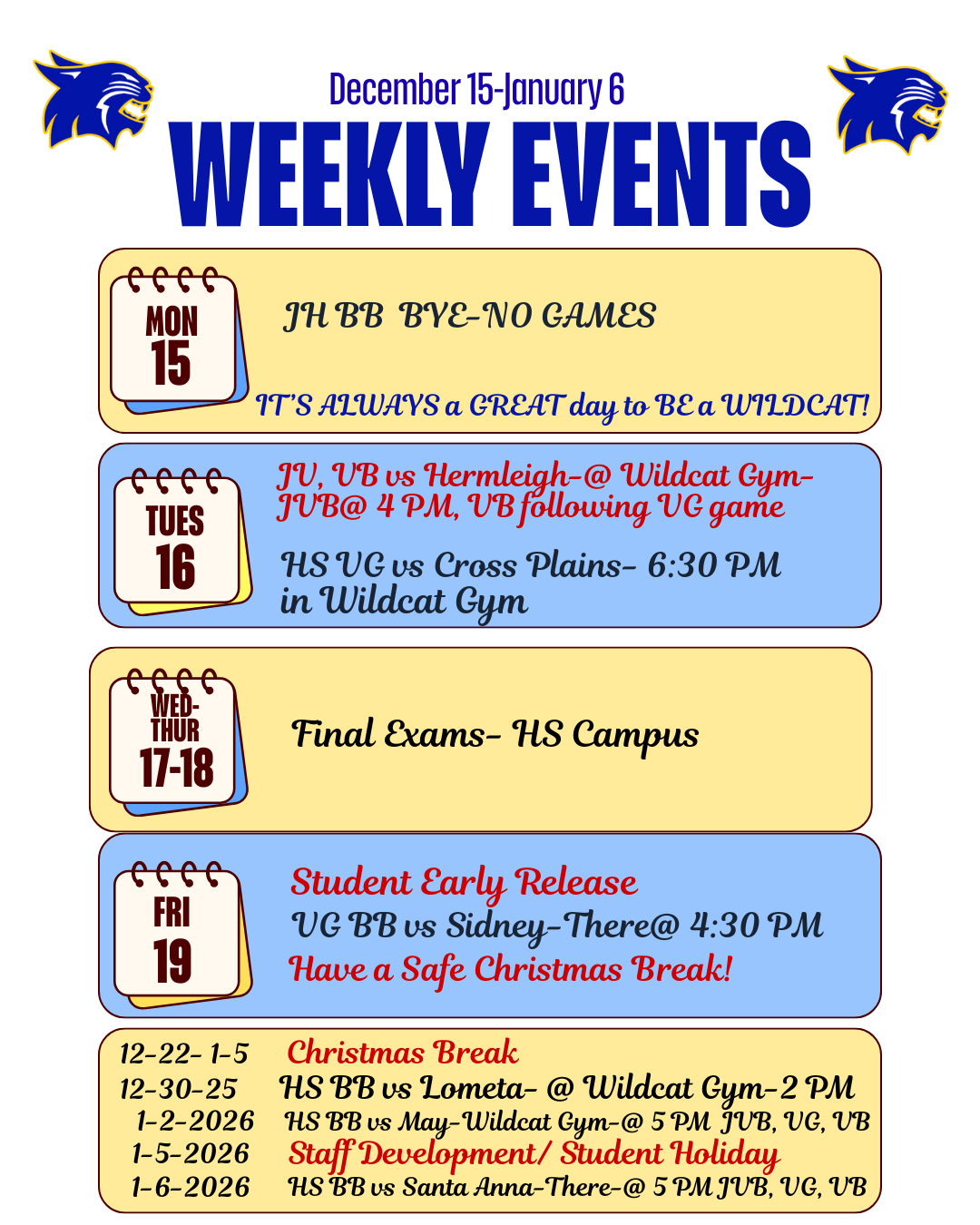 Weekly Events Christmas Break- Dec. 22-Jan.5 Classes will resume on Tuesday, January 6, at regular time. Have wonderful Christmas break from all of us at RSISD! Print